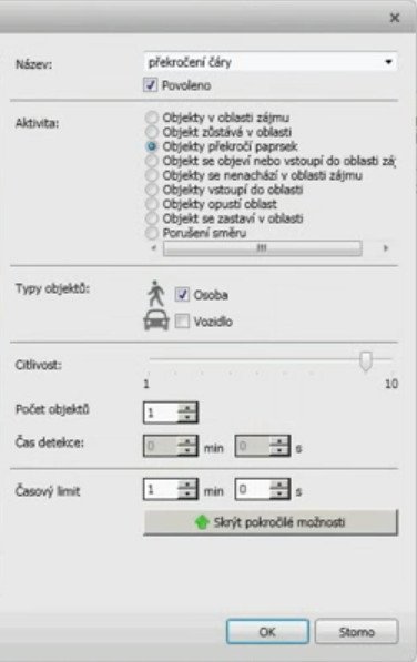V obraze, pomocou myši, vyznačíte oblasť záujmu a zvolíte, aké pravidlo sa bude vyhodnocovať. Môže sa jednať o vstup do zvolenej zóny, prekročenie čiary, porušenie smeru pohybu, alebo dlhšie postávanie osoby v oblasti záujmu. Poslednou voľbou je upresnenie sledovaného objektu. Iba zaškrtnete, ak ide o osoby, vozidlá alebo kombináciu.