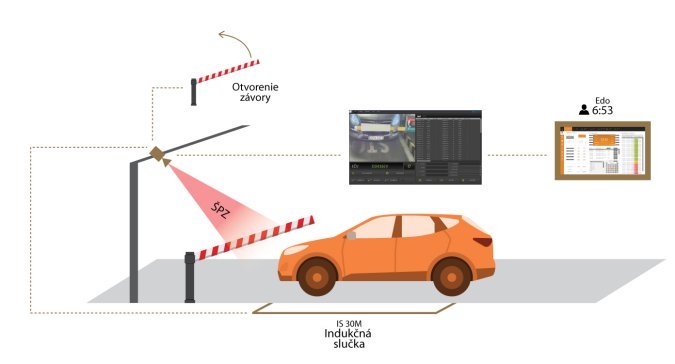 Osobný automobil, ktorý nie je vybavený RFID kartou s dlhým dosahom, možno ľahko identifikovať podľa registračnej značky. V tomto prípade je ideálny postup pre správne rozpoznanie vozidla nasledujúci. Vozidlo príde k spomaľovaču, kde jeho prítomnosť vyhodnotí indukčná slučka. Slučka dá pokyn kamere k získaniu snímky a vyhodnoteniu RZ. V prípade, že je daná RZ na zozname vozidiel s oprávnením ku vjazdu, závora sa otvorí.