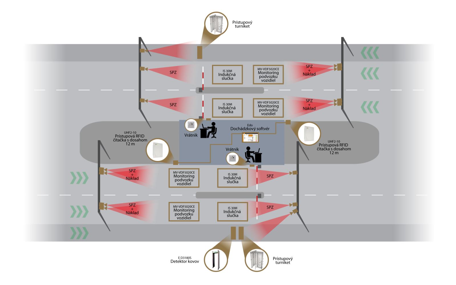 Celý systém bude zodpovedať nasledujúcej schéme, ktorá zahŕňa všetky vyššie uvedené postupy identifikácie. V náčrte je znázornená vrátnica, ktorá obsluhuje dva vjazdy aj výjazdy pre vozidlá a vstup s výstupom pre chodcov.