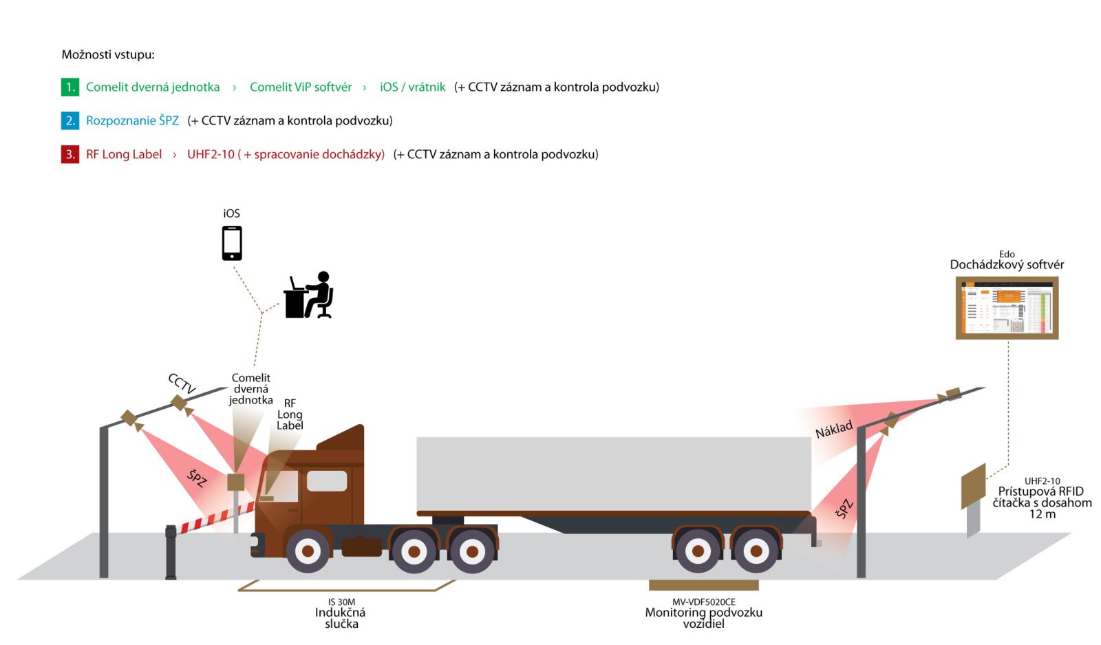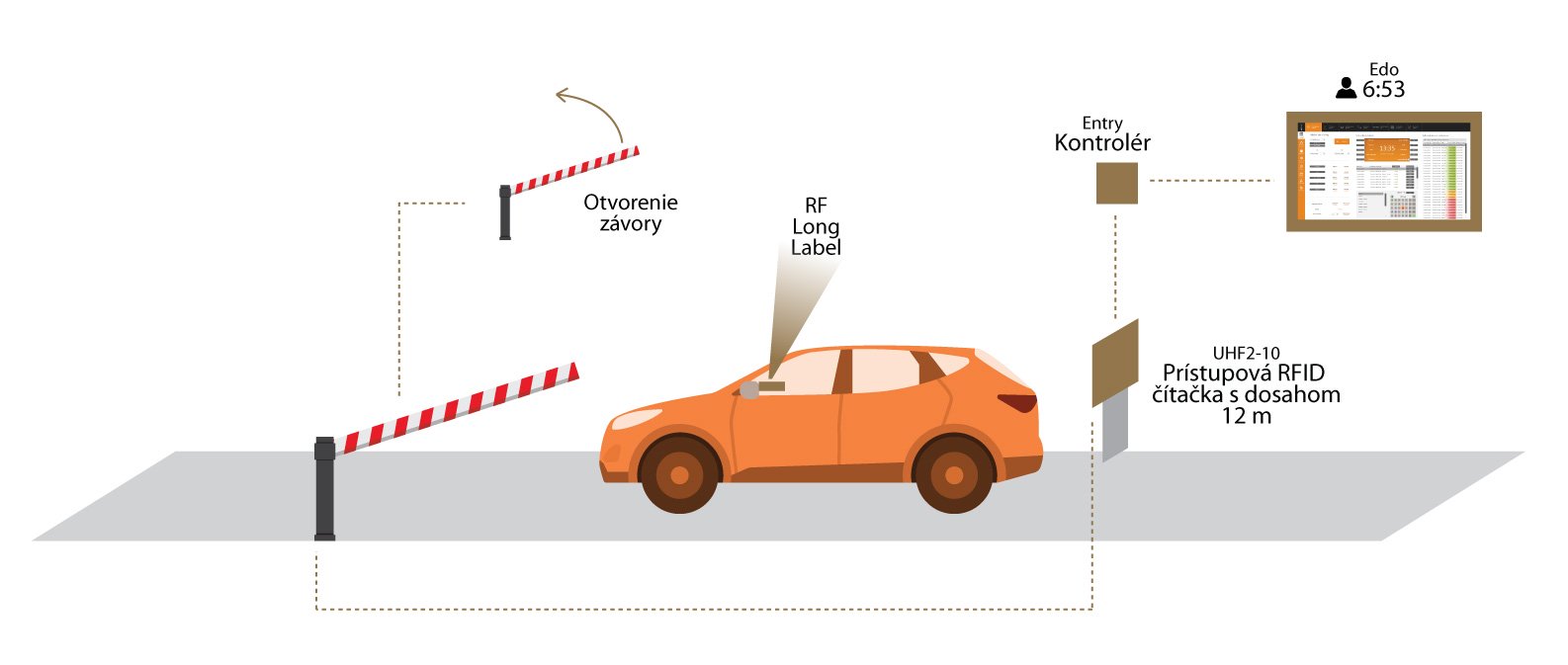 Na overenie totožnosti vozidla je najľahšie využiť RFID kartu s dlhým dosahom v kombinácii s odpovedajúcou čítačkou. Auto prichádza k identifikačnému bodu a bez zastavenia prejde. Čítačka UHF2-10 dokáže rozpoznať RFID kartu, umiestnenú za predným sklom až na 12 metrov. Opäť je možné impulz z overenia využiť na účely podnikovej dochádzky EDO.