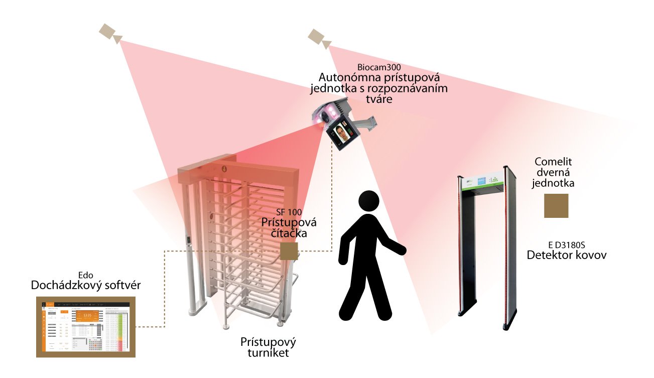 Pre uľahčenie vstupu je ideálnym pomocníkom zariadenie Biocam300, ktoré rozpozná prichádzajúcich podľa tváre a povolí priechod. Súčasťou balenia Biocam je aj čítačka odtlačkov prstov pre paralelnú identifikáciu. Výstup overenia totožnosti možno zároveň prepojiť s podnikovým dochádzkovým softwarom EDO, ktorý zapíše aktuálne dáta priechodu ako príchod zamestnanca do práce.