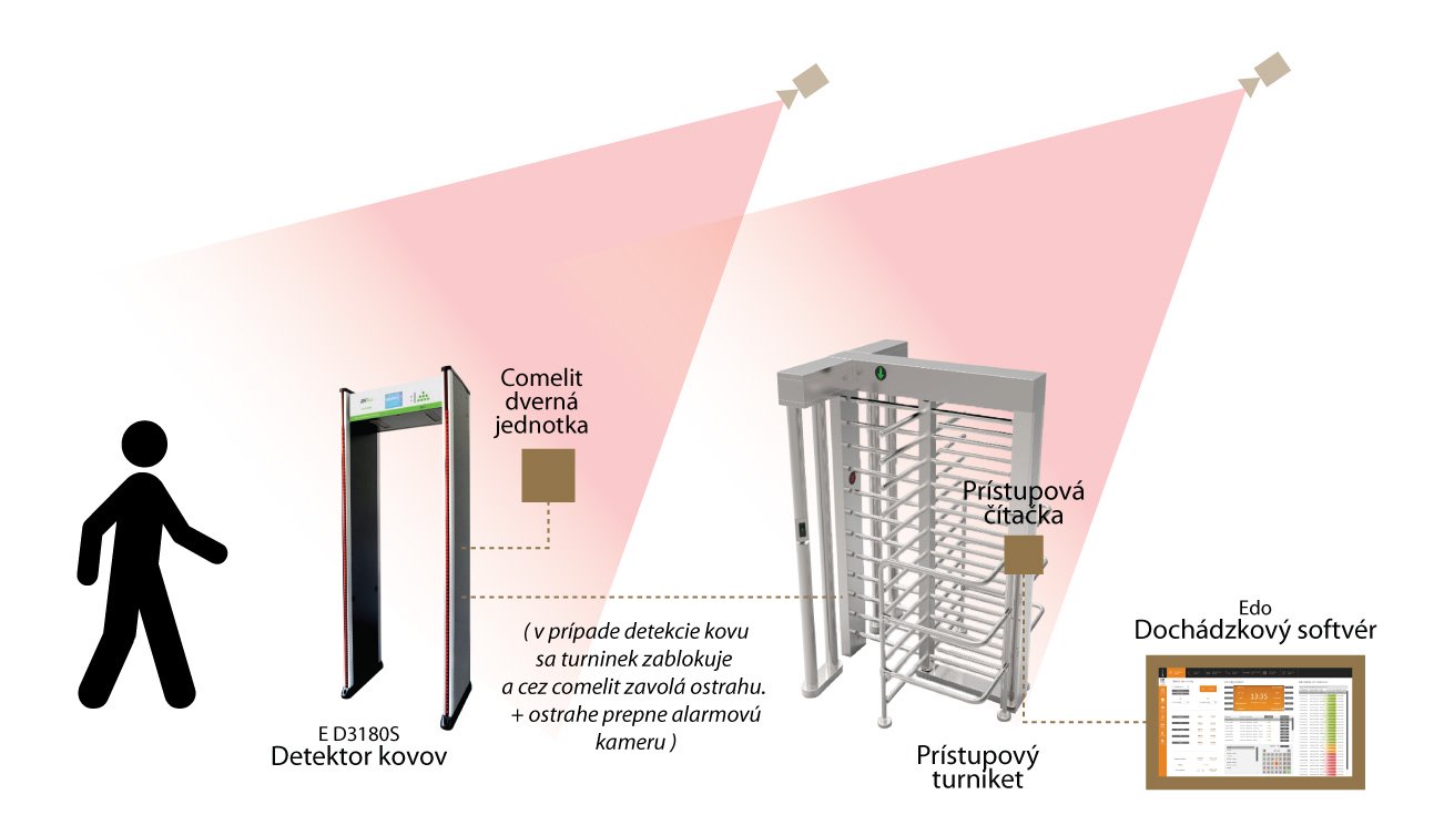 Pri odchode osoby zo závodu je procedúra overenia totožnosti úplne rovnaká ako pri vstupe. Líši sa len kontrolou na detekčnom ráme E D3180S, pre prípadné vynášanie materiálu. Zamestnanec prejde detekčným rámom a v prípade, že zariadenie vyhodnotí nadlimitnú prítomnosť kovových častíc, spustí sa alarm. Detekčný rám poplachovým výstupom zablokuje možnosť priechodu turniketom, upozorní strážnika, prepne kameru pri detekčnom ráme do poplašného okna a pomocou video telefónu vyvolá komunikáciu na najbližšieho strážnika.