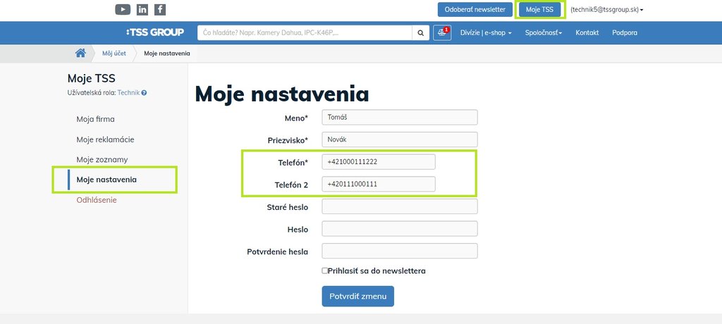 - Nastavenie telefónnych čísel môžu v rámci zákazníckej zóny Moja TSS vykonávať iba používatelia s užívateľskou rolou Administrátor. Pokiaľ je Vaša rola iná ako Administrátor, môžete správnosť uvedených telefónnych čísel skontrolovať, a prípadne aj zmeniť, v sekcii Moje nastavenia. Vykonané zmeny nezabudnite uložiť.