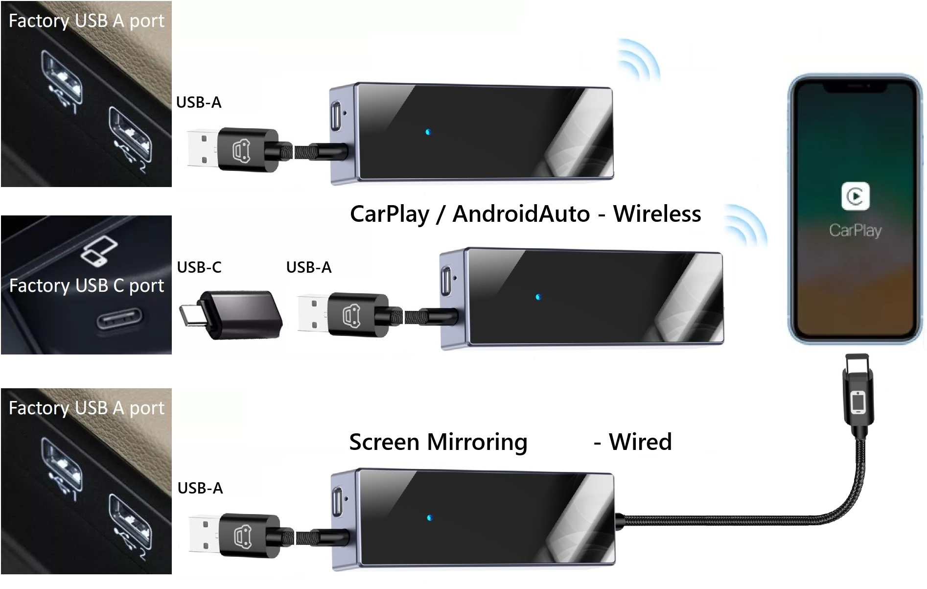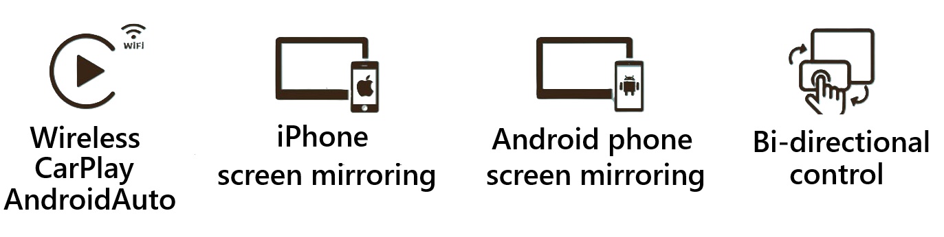 Okrem zrkadlenia obsahu telefónu bez obmedzení cez USB pripojenie, modul umožňuje aj bezdrôtové pripojenie telefónu k Apple CarPlay / AndroidAuto. Ovládanie podporovaných aplikácií zostáva zachované dotykovým displejom, tlačidlami na volante, prípadne iným spôsobom. Jednoduché zapojenie modulu - do USB slotu vozidla určeného pre telefón. Telefón sa pripája k jednotke vozidla cez modul automaticky (po prvotnom BT spárovaní).