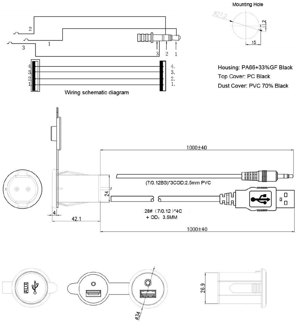 Predlžovací kábel AUX/USB dĺžky 1m, so zásuvkou pre osadenie do otvoru priemeru 27 mm.