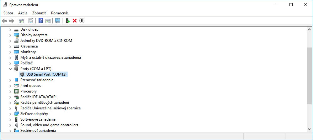 Po pripojení ústredne k počítaču určte, na ktorom COM porte je nainštalovaný prevodník USB-RS. Otvorte Ovládací panel, potom Správcu zariadení a v ňom Porty (COM a LPT). Tu môžete overiť, ktoré číslo COM portu bolo priradené prevodníku. Tieto informácie si zapamätajte.