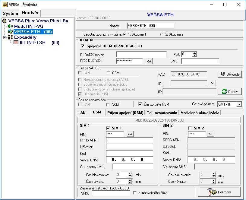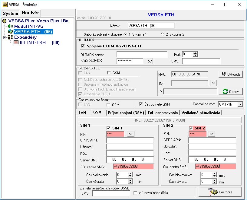 V programe DLOADX otvorte kartu ŠTRUKTÚRA / HARDVÉR a zvoľte VERSA-ETH zo zoznamu dostupných zariadení. V okne, ktoré sa zobrazí, otvorte kartu GSM. Vyberte možnosť, či chcete využívať, iba jednu SIM kartu alebo dve karty. Zadajte PIN kódy a čísla centra SMS do okna konfigurácie SIM karty. Kliknite na ikonu UPLOAD DO ÚSTREDNE pre uloženie zadaných údajov.