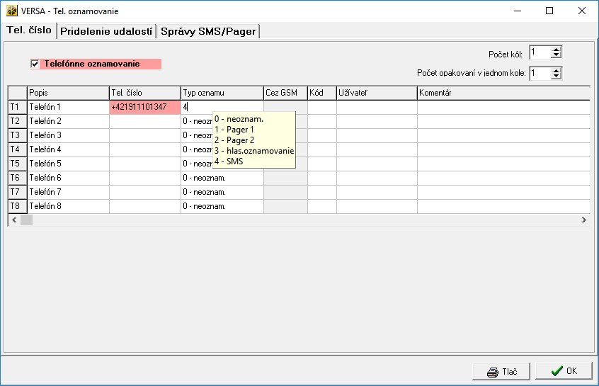 Kliknite na ikonu TELEFÓNNE OZNAMOVANIE na paneli s nástrojmi v programe DLOADX. V okne, ktoré sa zobrazí, otvorte kartu TEL. ČÍSLO a povoľte voľbu TELEFÓNNE OZNAMOVANIE a zadajte telefónne čísla. Môžete zadať až 8 telefónnych čísiel. V stĺpci TYP OZNAMU vyberte voľbu 4 - SMS.