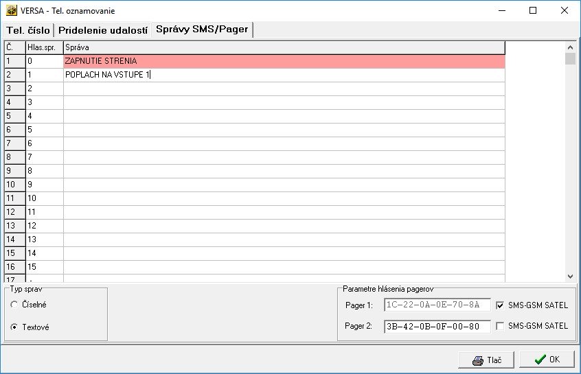 V tom istom okne otvorte kartu SPRÁVY SMS / PAGER. Do tabuľky zadajte správu pre každú udalosť, ktorú má ústredňa oznámiť zaslaním SMS správy, napr. zapnutie stráženia, poplach atď. Môžete zadať až 64 rôznych správ.