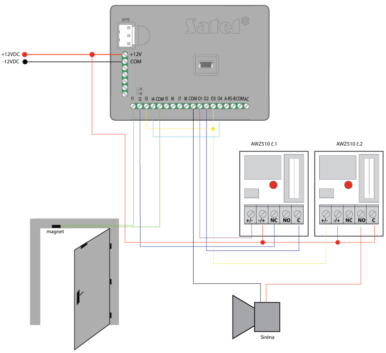 Pokiaľ potrebujete kontrolovať dlho otvorené dvere, dostať o tom push notifikáciu do mobilnej aplikácie alebo email, spustiť sirénu počas prekročenia povoleného času otvorenia dverí a mať vzdialenú správu nad týmto riešením, postupuj te podľa nasledovného zapojenia a nastavenia modulu ETHM-A.