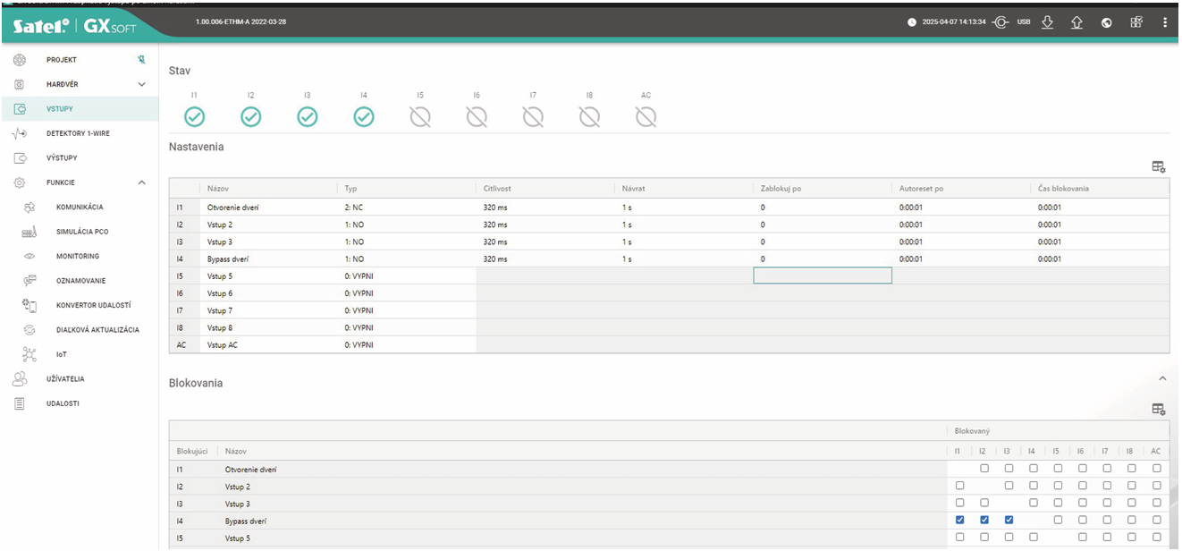 Blokovania - vo vstupoch v časti blokovania pre vstup l4 zvoľte blokované vstupy l1, l2. l3. Toto blokovanie môže slúžiť pokiaľ potrebujete z nejakého dôvodu mať dlho otvorené dvere bez toho aby znela siréna a chodili notifikácie.