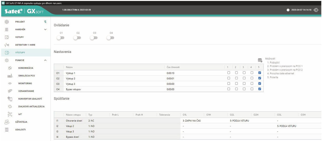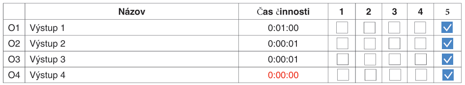 - Nastavenie výstupov - výstupy nastavte podľa nasledovných tabuliek. Čas činnosti výstupu č.1 určuje ako dlho môžu byť otvorené dvere bez toho aby začala znieť siréna a bola odoslaná notifikácia. Výstup č.4 bude slúžiť na bypass vstupov 1 až 3 aby mohli zostať dvere dlho otvorené bez spuste nia sirény a odoslania notifikácií. Výstup bude možné prepínať v aplikácii GX Control alebo v software GX Soft.