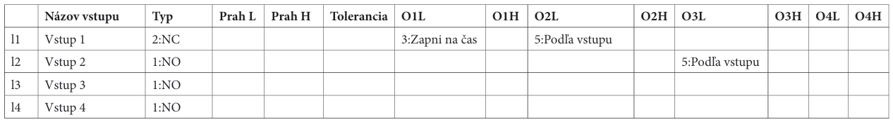 Pokiaľ by ste chceli aby siréna po dlhom otvorení dverí znela konkréty čas a nie pokiaľ sú otvorené dvere, nastavte výstupu č.3 šas ako dlho má znieť a v Spúšťaní nastavte v riadku l2 a v stĺpci O3L 3:Zapni na čas.