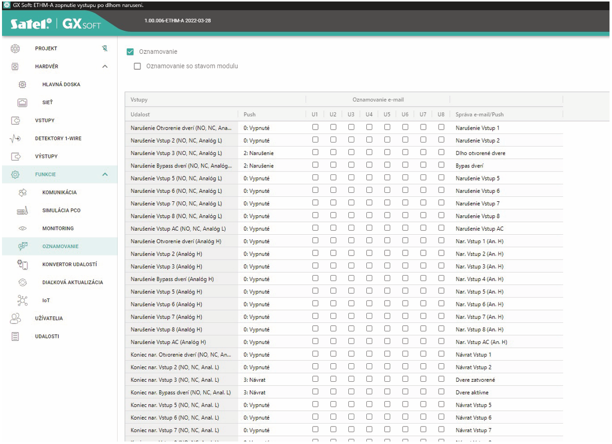 - Oznámenia - v oznámeniach si zapnite zasielanie notifikácií len z narušenia vstup č.3 - dlho otvorené dvere a pokiaľ chcete aj notifikáciu o bypasnu tí vstupov tak aj narušenie vstupu č.4. Následne pokiaľ chcete mať informáciu aj o zatvorení vstupov, povoľte si aj konce narušenia týchto vstupov.