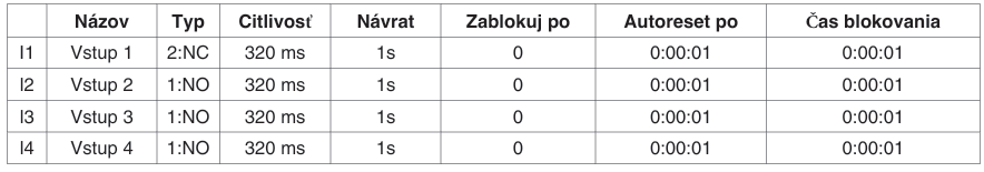 - Nastavenie vstupov - na správnu činnosť budeme potrebovať 4 vstupy. Vstupy nastavte podľa nasledovnej tabuľky: