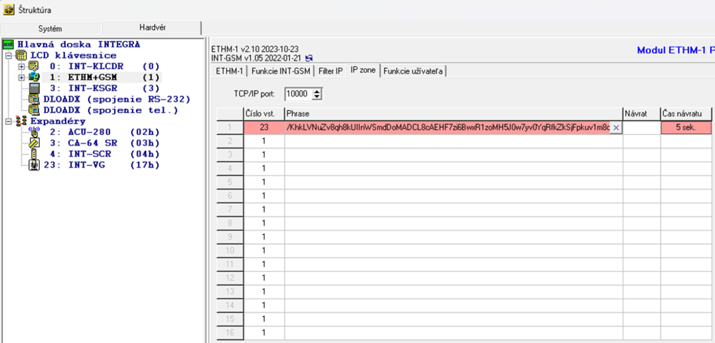 V položke „TCP/IP port“ nastavte TCP port na ktorom bude ústredňa „počúvať“ udalosti z kamery. V stĺpci „Číslo vst.“ nastavte číslo virtuálneho vstupu, na ktorom chcete detegovať udalosť z kamery. V stĺpci Phrase môžete vygenerovať string, ktorý zadáte v kamere pri aktivovaní vybranej udalosti. Čas návratu je dĺžka zopnutia vstupu. Po tomto čase sa vstup vráti do kľudového stavu.