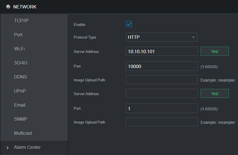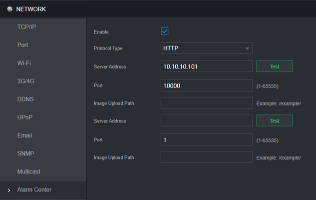 V nastaveniach NVR v položke „SÍŤ/NETWORK“ vyberte kartu „Centrum alarmu/Alarm Center“ a povoľte funkciu. Vyberte protokol HTTP, nastavte IP adresu komunikačného modulu ETHM-1 Plus a port, ktorý ste nastavili v predchádzajúcich krokoch.