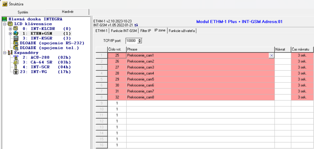 V položke „TCP/IP port“ nastavte TCP port na ktorom bude ústredňa „počúvať“ udalosti z NVR. V stĺpci „Číslo vst.“ nastavte číslo virtuálneho vstupu, na ktorom chcete detegovať udalosť z NVR. V stĺpci Phrase zadajte názov pravidla, ktorý zadáte v NVR pri aktivovaní vybranej udalosti. Čas návratu je dĺžka zopnutia vstupu. Po tomto čase sa vstup vráti do kľudového stavu.