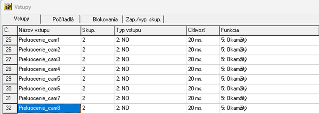 V nastaveniach vstupov vyberte vstup, ktorý ste nastavili ako virtuálny v predchádzajúcich krokoch. V našom prípade vstup 32. Zapíšte názov, nastavte typ vstupu a funkciu podľa požiadaviek. (nastavenia sú rovnaké ako pri hardvérovom vstupe, PIR detektor a pod.)