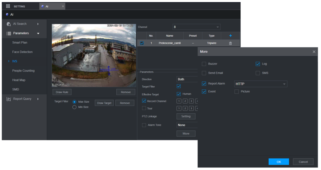 V nastaveniach udalosti napr. IVS zadajte názov pravidla „Jméno/Name“, ktorý ste zadali v stĺpci „Phrase“ na karte IP zone v nastaveniach ETHM-1 plus modulu. V ďalších nastaveniach „Více/More“ povoľte voľbu „Nahrání alarmu/Report Alarm“ povoľte voľbu „Událost/Event“ a vyberte protokol HTTP.