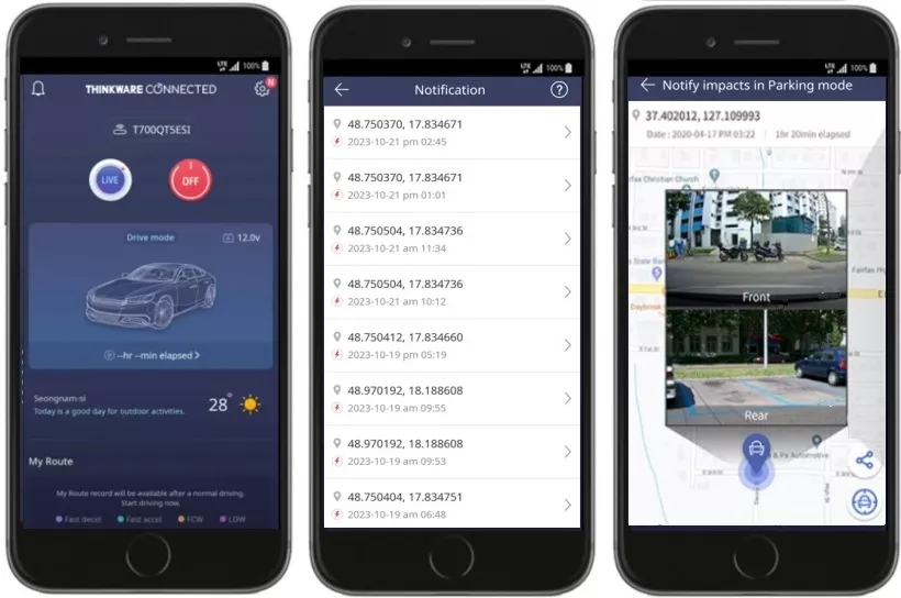 Pre pridanie Wi-Fi sietí do kamery a prvotné nastavenia nahrávania použijete DASH CAM LINK aplikáciu. Pre vzdialený prístup, nastavenie notifikácií, sledovanie histórie jázd sa využíva aplikácia THINKWARE CONNECTED. Kamera sa vždy pripojí na internet cez Wi-Fi sieť s najlepším signálom.